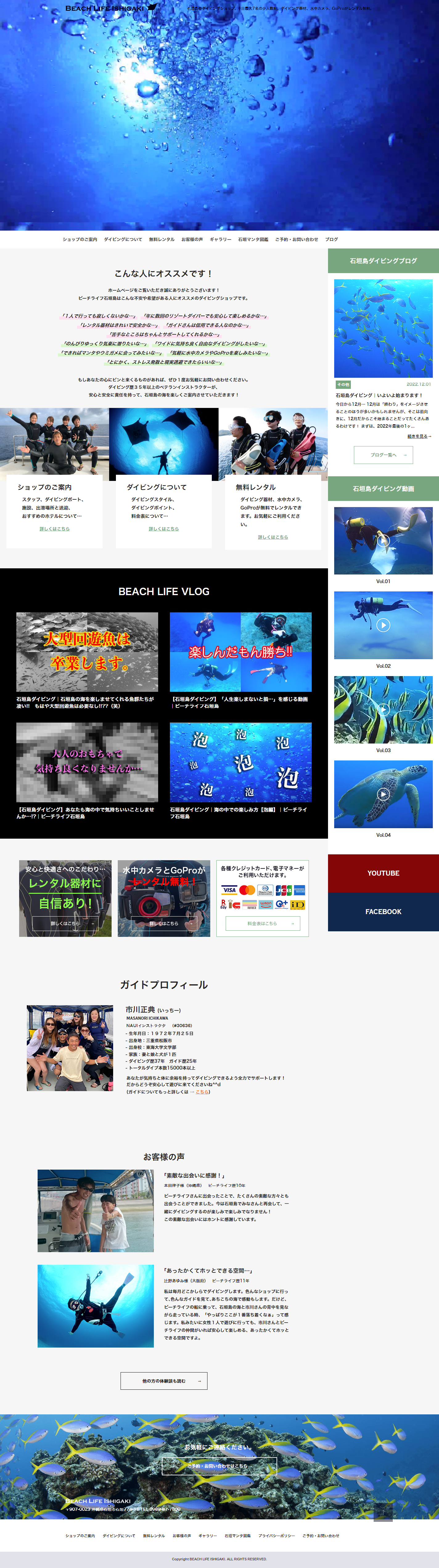 石垣島でダイビングショップを営むビーチライフ様のオフィシャルサイトを制作しました。 競合が多い中、ビーチライフの強みである「マンタ」に関する情報・経験・想いで差別化を図るために、オリジナルコンテンツとして「マンタ図鑑」をCMSで構築。またオーナーの強みである水中写真や動画撮影を存分に活かすためにトップページの動画を始め、写真を活かすデザインを意識しました。他社に真似できない強みを表現できた結果、新規顧客が増加していますが、現在も年に一度のペースでサイトの内容やメッセージを精査して改善を継続しています。