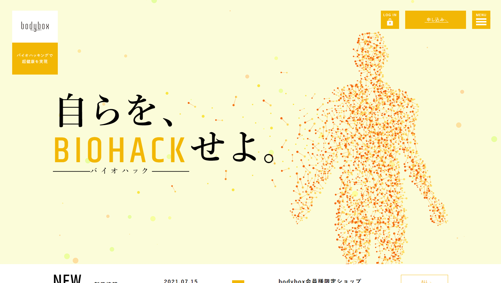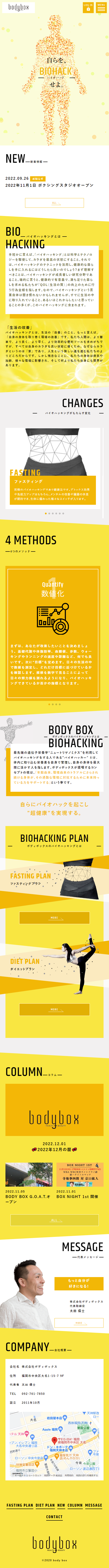 福岡でボディメイクのサポートをされている、「株式会社 ボディボックス」様のコーポレートサイトを制作させていただきました。 「バイオハッキング」という東洋医学や遺伝子工学に基づいた、様々なメソッドとサポートプランを視覚的にもわかりやすく、また、印象付けるため、躍動感のあるデザインとモーションでサイトの構築を行いました。