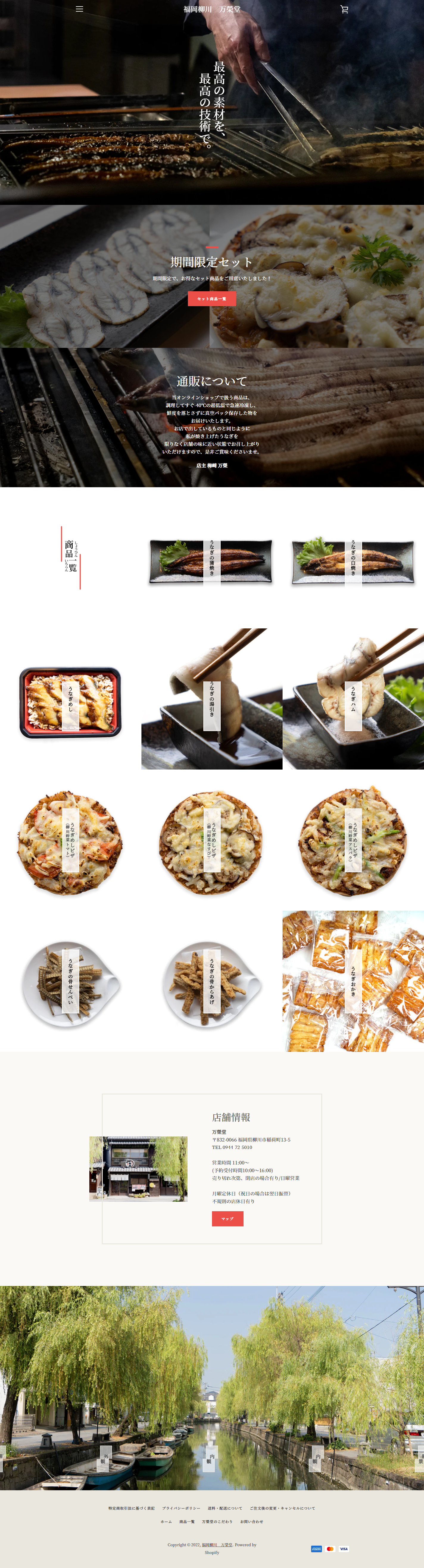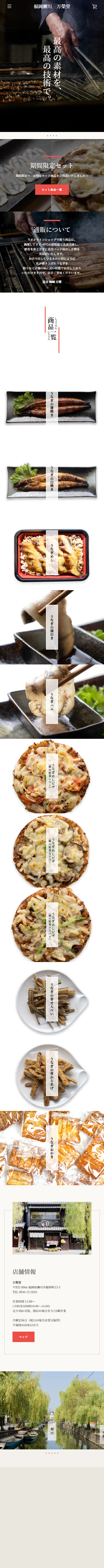 万榮堂様ではShopifyを使ったECサイト制作を行いました。 万榮堂様は柳川に実店舗を持たれるうなぎの飲食店ですが、そのお店で出されている料理を瞬間冷凍した物を販売しております。 今回はShopifyによる構築ですので、サイト構成などはおおよそテンプレートに沿った物ですが、食べ物の通販ですので特に写真にこだわりました。 写真からいかに温度を伝えるか、美味しそうと思っていただけるか、現地で実際にうなぎを焼いていただきながらカメラマンとディレクターで確認しながら撮影を重ねました。 弊社では撮影班も社内にいますので、デザインに携わる者がどのような画像をイメージしているのかを明確にカメラマンに伝え、現場で確認しながらその画を撮れるというメリットがございます。