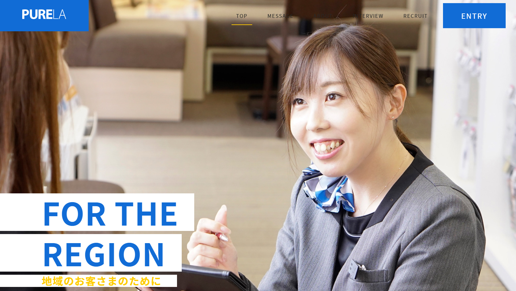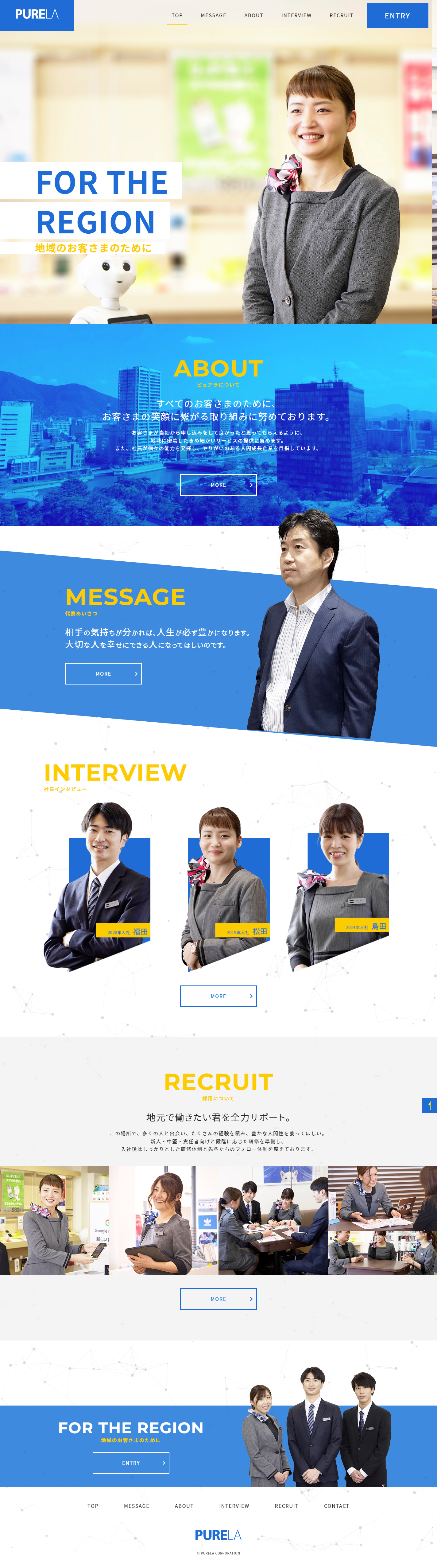 北九州を中心にソフトバンク関連商品を販売している「株式会社ピュアラ」様の採用サイト。 「いつでも何でも相談ができる町のでんき屋さん」のような親身で社員、地域の方への想いがあふれる企業を伝えるようなサイトを目指しました。 実際に働いているスタッフさんの撮影を行い、人の魅力が伝わるコンテンツをメインに構成をたてています。 ターゲット層が10代後半~20代、明るく元気なイメージ、1度るとインパクトがあるビビットカラーを使用しました。 採用メッセージはインタビューを行い、ライティングを行っています。