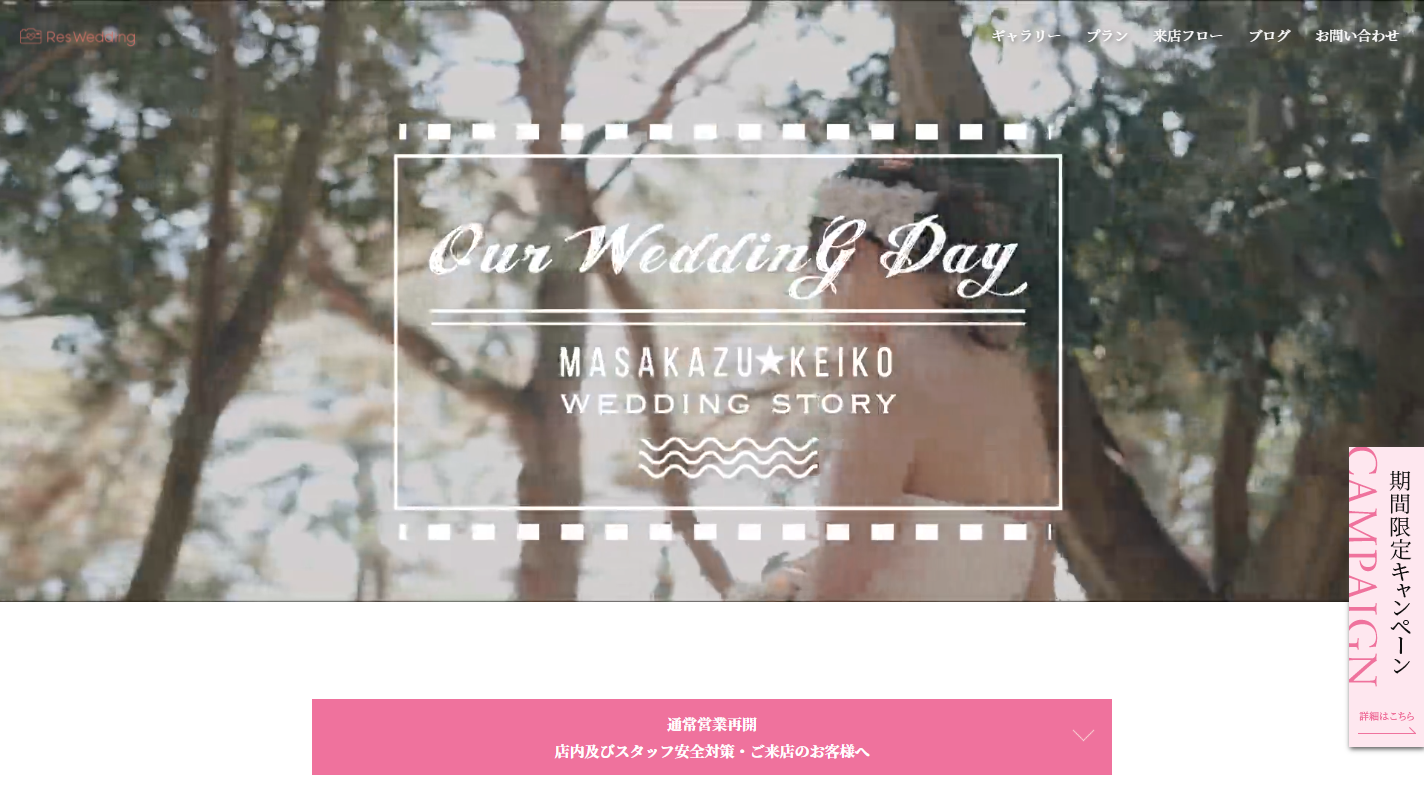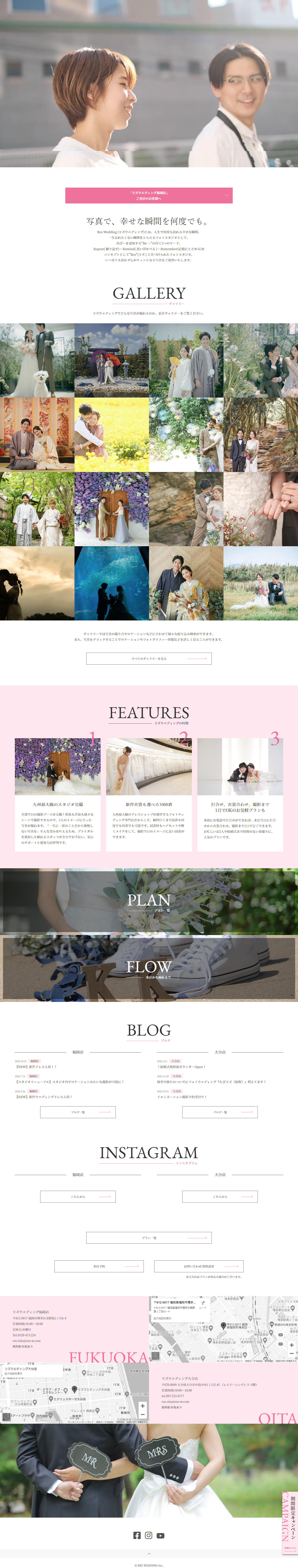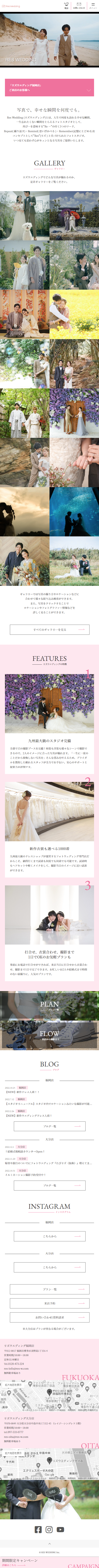 福岡、大分にあるフォトスタジオ「RES WEDDING(リズウエディング)」様です。 フォトだけでなく、グループにチャペルや衣装のレンタルを行っているため、ウエディングフォトはすべてお任せが可能です。 スタジオ、ロケーション、様々なシチュエーションでの撮影が可能なため、ホームページにはギャラリー登録機能を充実させました。 ロケ地やシチュエーション別での絞り込みが可能で、ユーザーが撮影イメージをしやすいようにしました。 撮影に関する不安をなくす、親近感をもってお問い合わせをしていただけるよう、カメラマンのプロフィールやインスタを紹介コンテンツをいれました。