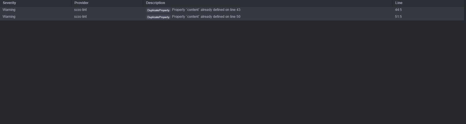 上記の画像では警告が二つでていますね。該当の表示をクリックすると、画面下に下記のような表示が出ます。この場合、43行目と50行目のスタイルがDuplicatePropertyというルールに反してますよという表示ですね。
