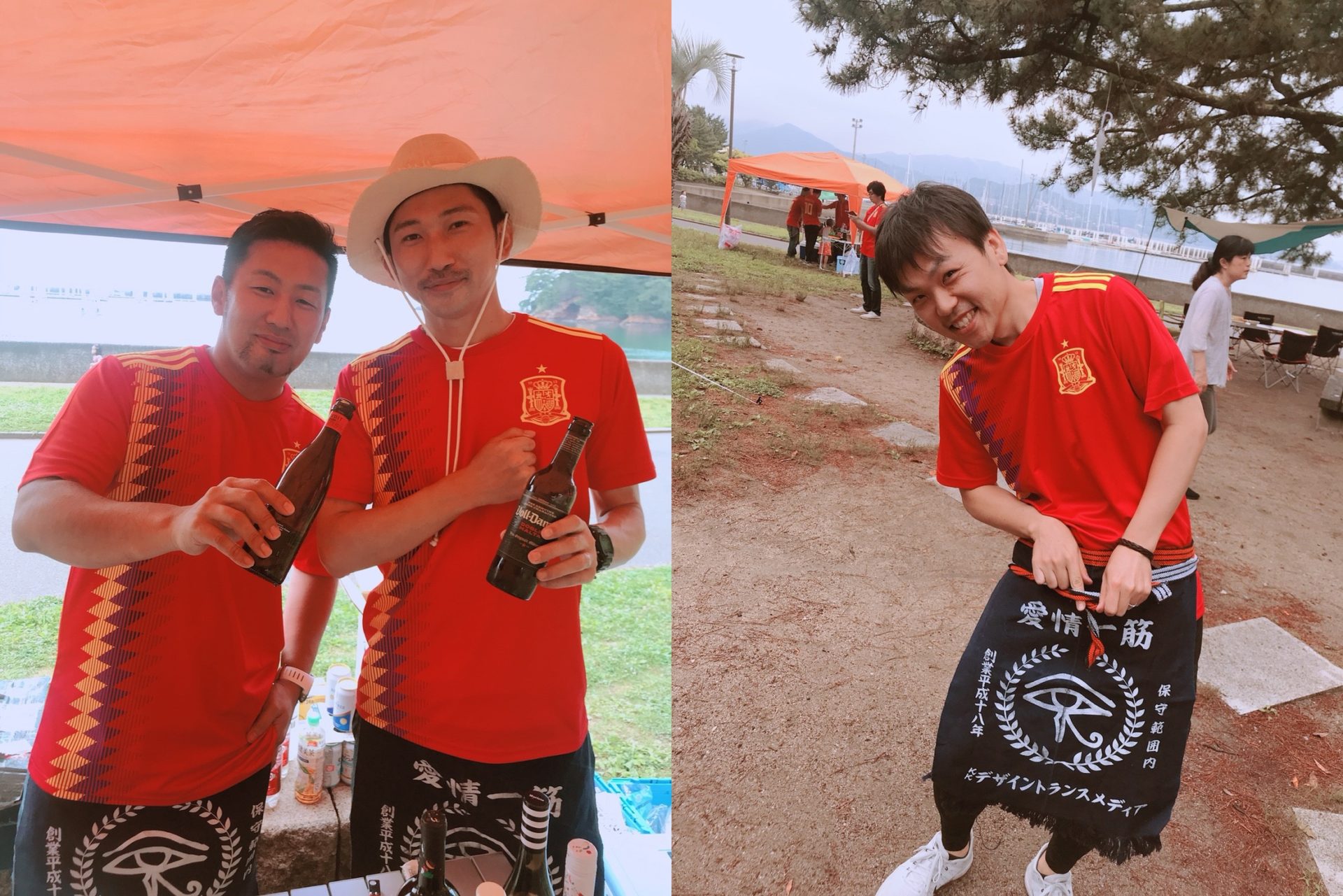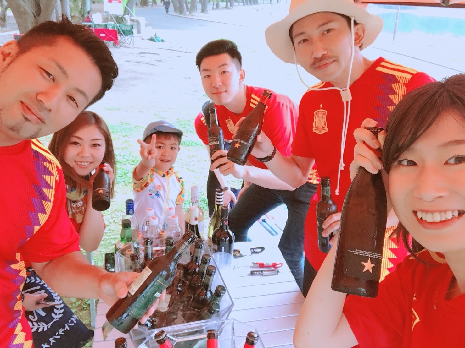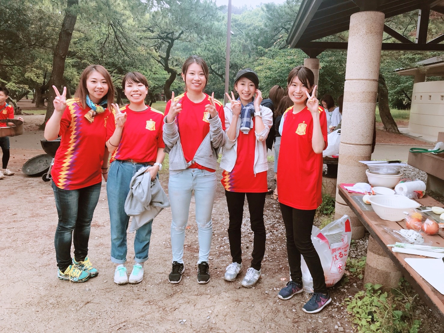 弊社では年に何度もBBQを開催しており、必要なものはほどんど揃っています。会社の一室が、アウトドア用品で埋まってしまうほど(!)毎年この季節のBBQでは、お世話になっているお客様とそのご家族をご招待しています。弊社の社員の家族も交じって、今年は約60名での大バーベキュー大会!当日は朝から雨が降っていて、会場の小戸公園に集合した私たちも不安の表情…しかし、ボス(弊社代表)の宣言通り、調理を始めるころには快晴に!今年のBBQのテーマであるスペインのユニフォームと前掛けを身に着け、準備を始めました。