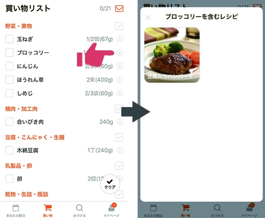 3.どの料理に使う材料かすぐにわかる買い物リストの左に、iマークがあり、タップするとその材料を使うレシピを教えてくれます。