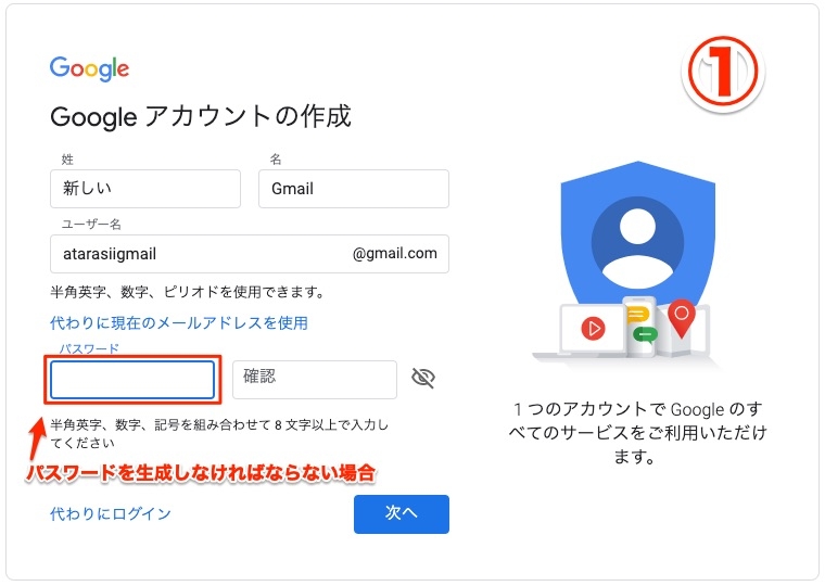 新しくGoogleアカウント(Gmail)を作成する場合を例に説明します。