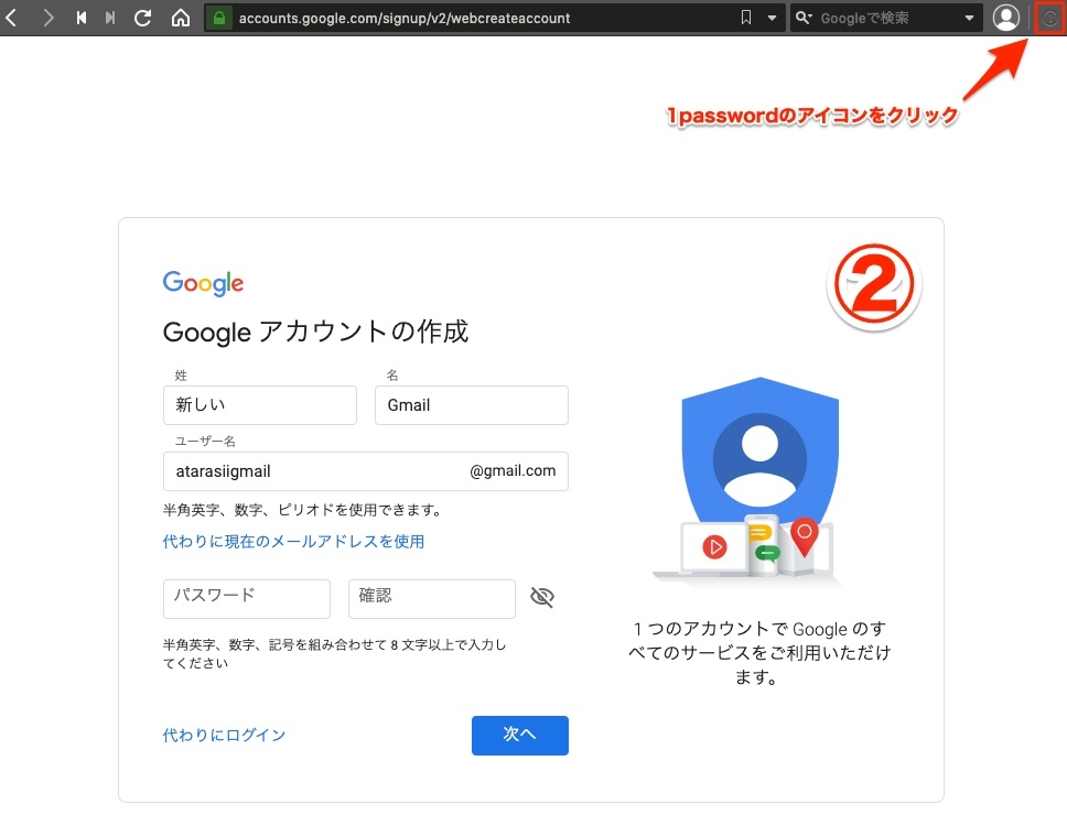 2.ブラウザの1Passwordのアイコンをクリックし…