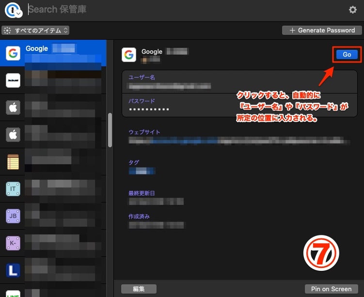 7.保管されたユーザー名・パスワードが表示され、『GO』をクリックすると…