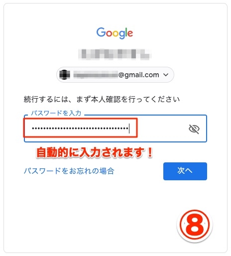 右上の『保存してコピー』をクリックすると、先ほどのパスワードが一時的にコピーされていますので、パスワード入力欄にペーストして、入力を続け、完了させます。