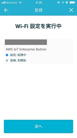 Wi-Fi設定を実行中の画面が表示されるので、「設定:処理中」から「設定:成功」となるまで待ちます。「設定:成功」になったら、「次へ」ボタンを押します。