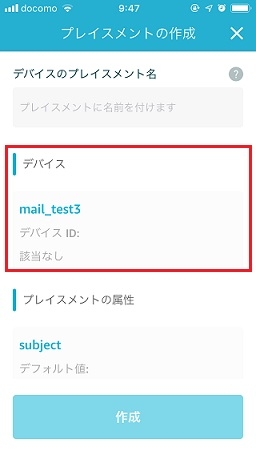 プレイスメントの作成を押して、任意の「デバイスのプレイスメント名」デバイスの箇所をタッチすると、登録したデバイスが表示されるので、選択して、作成ボタンを押します。