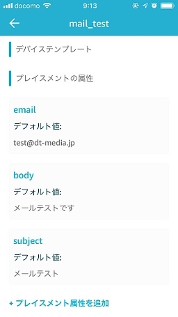 ※下にプレイスメント属性として、プロジェクトで設定した、 メールを送信するときの情報が表示されていますが、プロジェクト作成時と同じ値が 入っているはずなので、ここでは変更の必要はないかと思います。