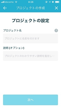 プロジェクトの入力フォームが表示されるので、以下を入力して、「次へ」ボタンを押します。