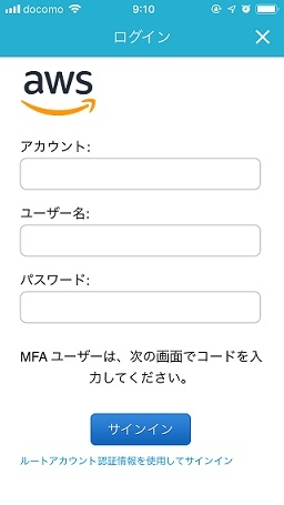 インストールしてアプリを起動すると、AWSアカウントでのログインを求められるので、ログイン情報を入力します。