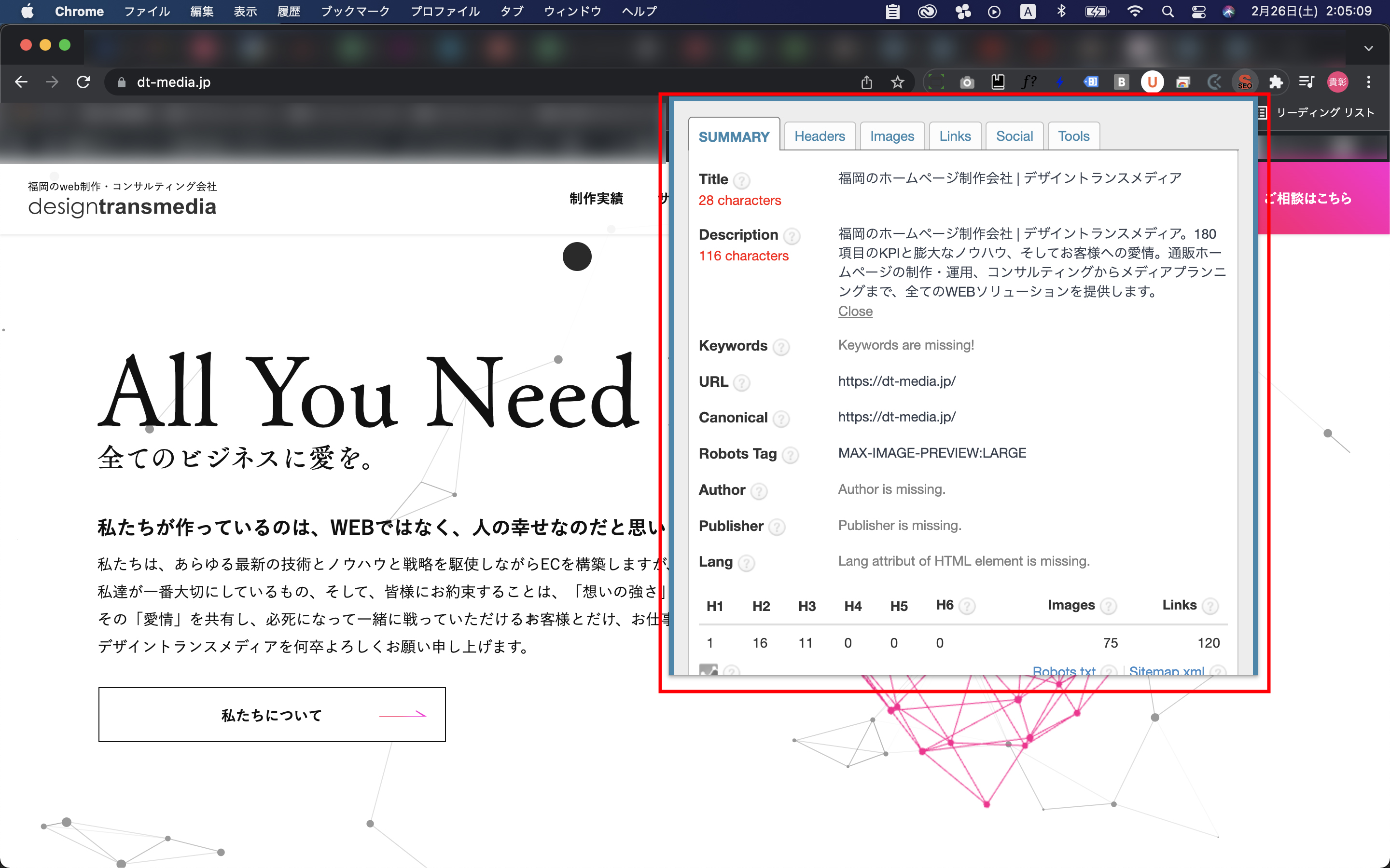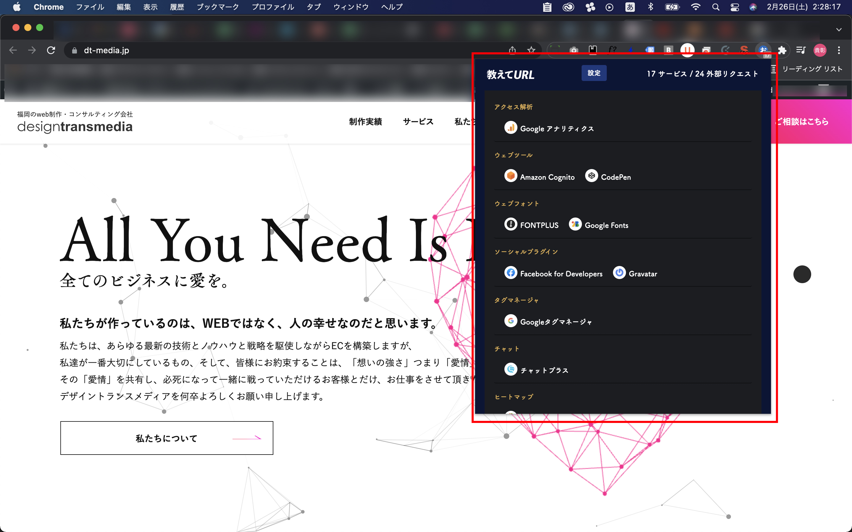 現在表示しているサイトがどのようなツールやサービスを使用して構築されているのかを調べることができます。 つまり、競合webサイトの構造が把握できます。 売り上げを伸ばしている競合が使用しているツールなどがわかれば、 こちらも組み込んで対応がしていけるといった具合です。 赤枠の部分に、埋め込んでるタグやフォントなども含めて調べられるものが全て表示されます。