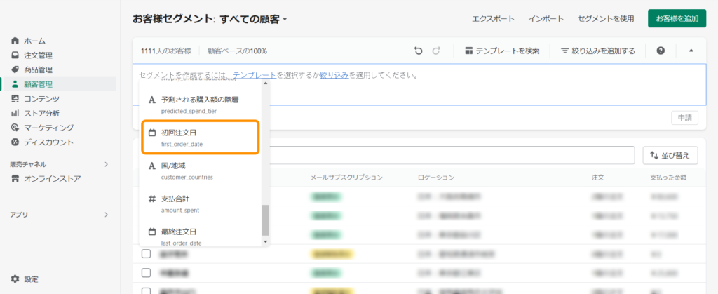入力欄に初回注文日の演算子「first_order_date」が表示されます。