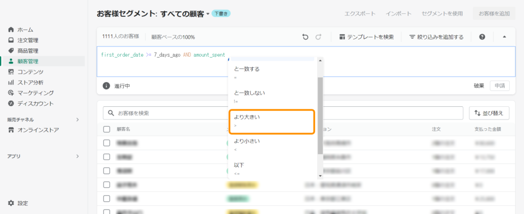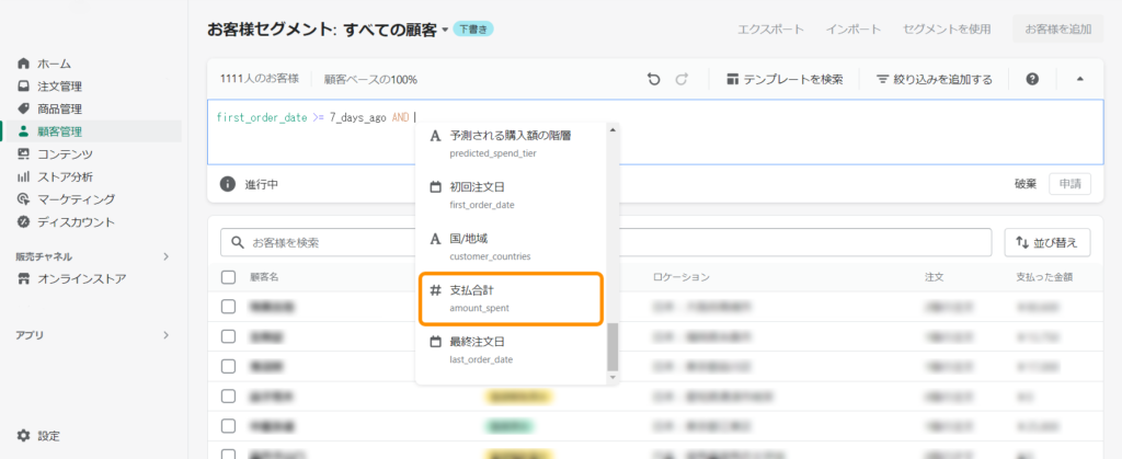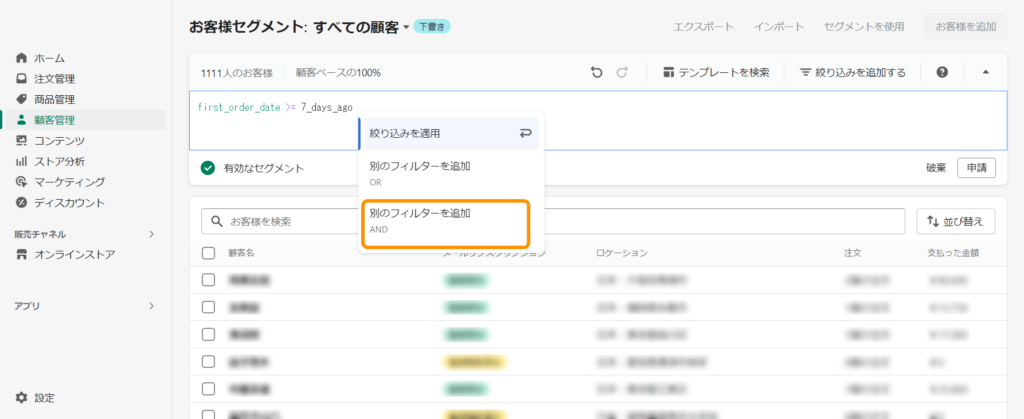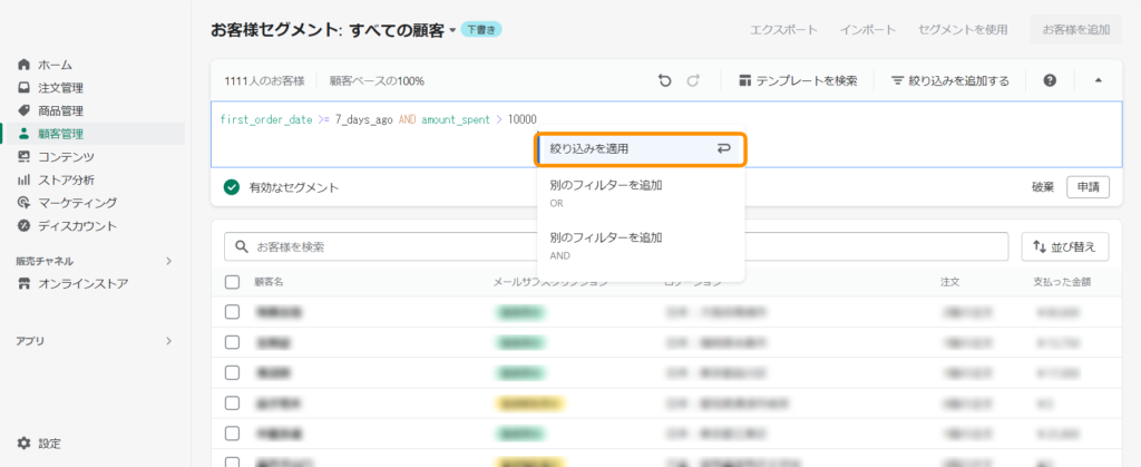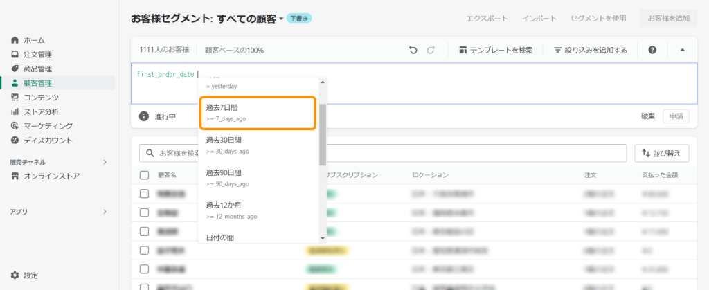 例として、「初回注文日が過去1週間以内かつ10,000円以上購入したお客様」を絞り込んでいきます。