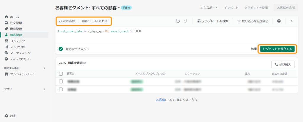 今回セグメントした「初回注文日が過去1週間以内かつ10,000円以上購入したお客様」を画面右の「セグメント情報を保存する」から保存して、いつでも呼び出すことが可能です。