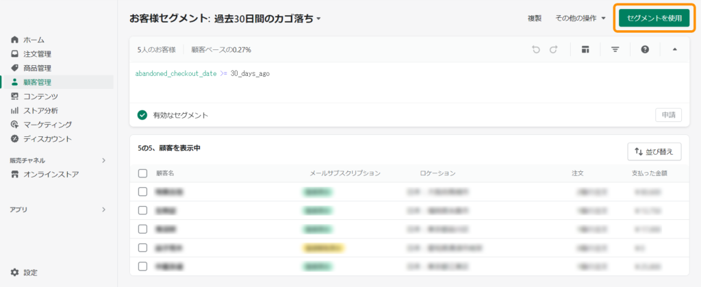 お客様セグメント選択後、画面右の「セグメントを使用」ボタンを選択