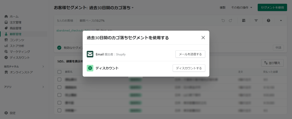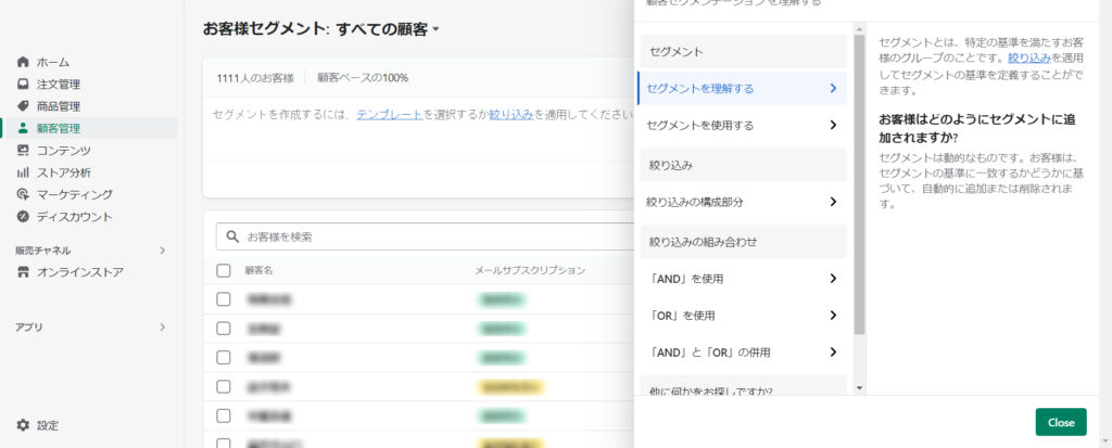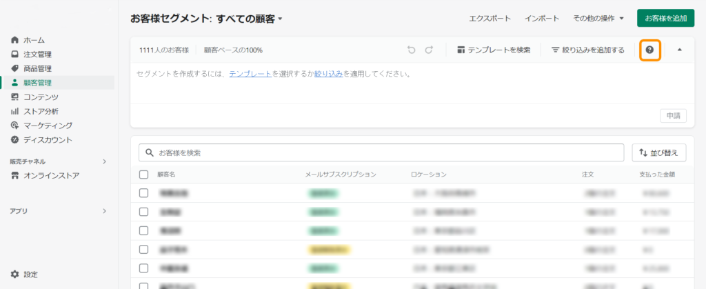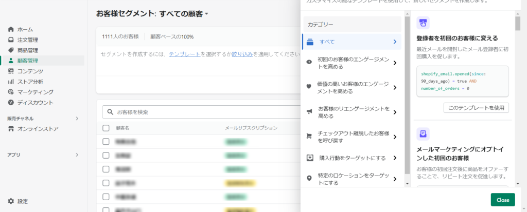 Shopifyにはお客様の購入履歴や住所、メールアドレスなど顧客情報を管理した顧客管理ページがあります。顧客管理ページにある「お客様セグメント」を活用してお客様を情報ごとにセグメントすることで様々なマーケティングに利用可能です。