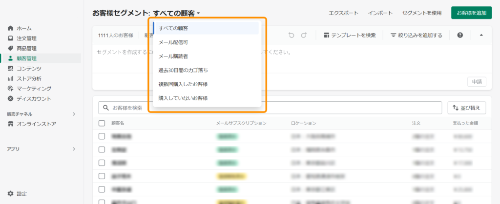 「すべての顧客」「メール配信可」「メール購読者」などあらかじめセグメントが設定されています。