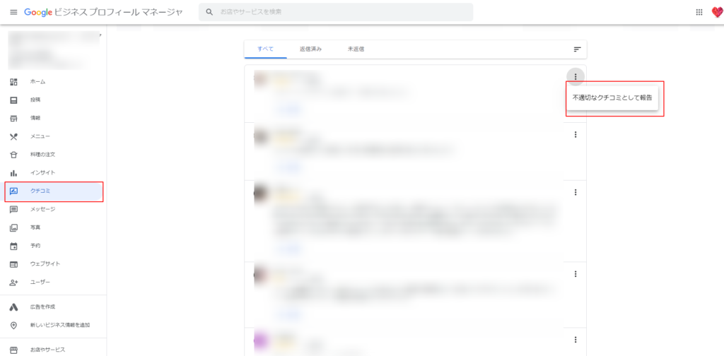 ホーム画面左メニュー「クチコミ」より報告したいクチコミから報告ボタンを送ります。