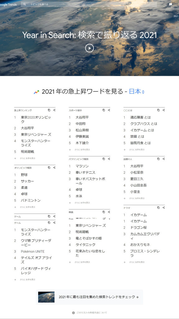 ニュースで紹介されることも多い機能。1年間で人気のあったキーワードがランキングで表示されます。