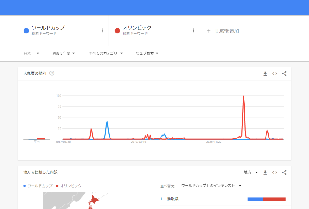 下のグラフは過去5年間で「ワールドカップ」と「オリンピック」の検索数を比較したものです。