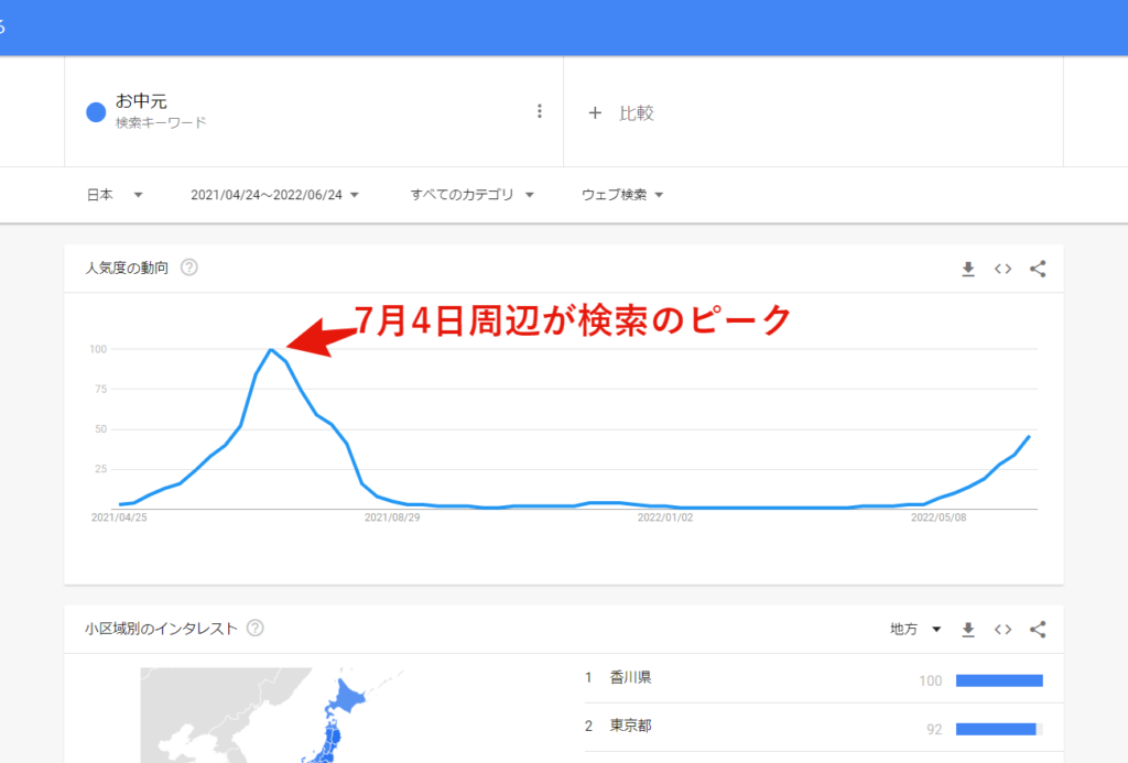 グラフを見ると、5月初旬から徐々に検索数が増加していき、7月1週目にピークを迎えることがわかります。