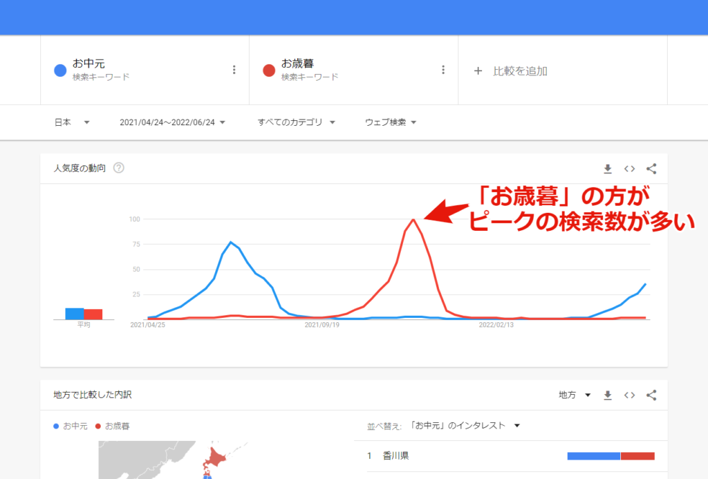 検索される期間はお中元の方がやや長めですが、ピークの検索数は「お歳暮」の方が多いことがわかります。