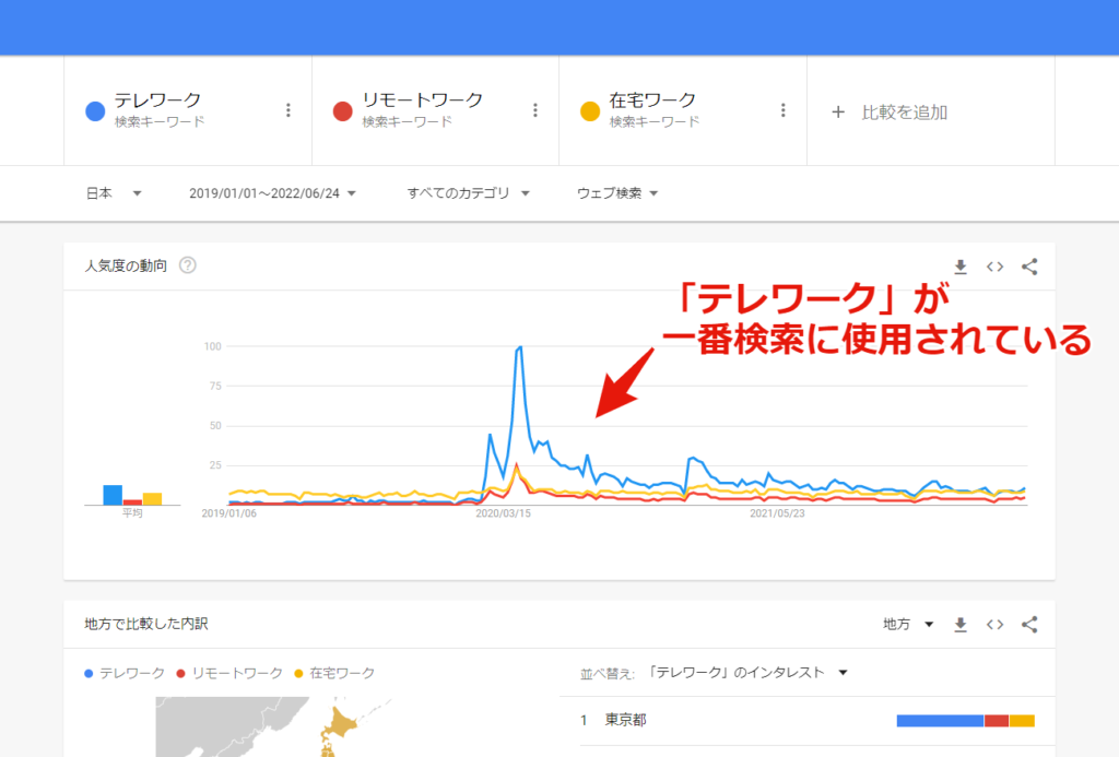 厳密に言えば、言葉それぞれの意味が異なることもあるのですが、一般的には、「テレワーク」というキーワードが一番検索に使用されてきたことがわかります。