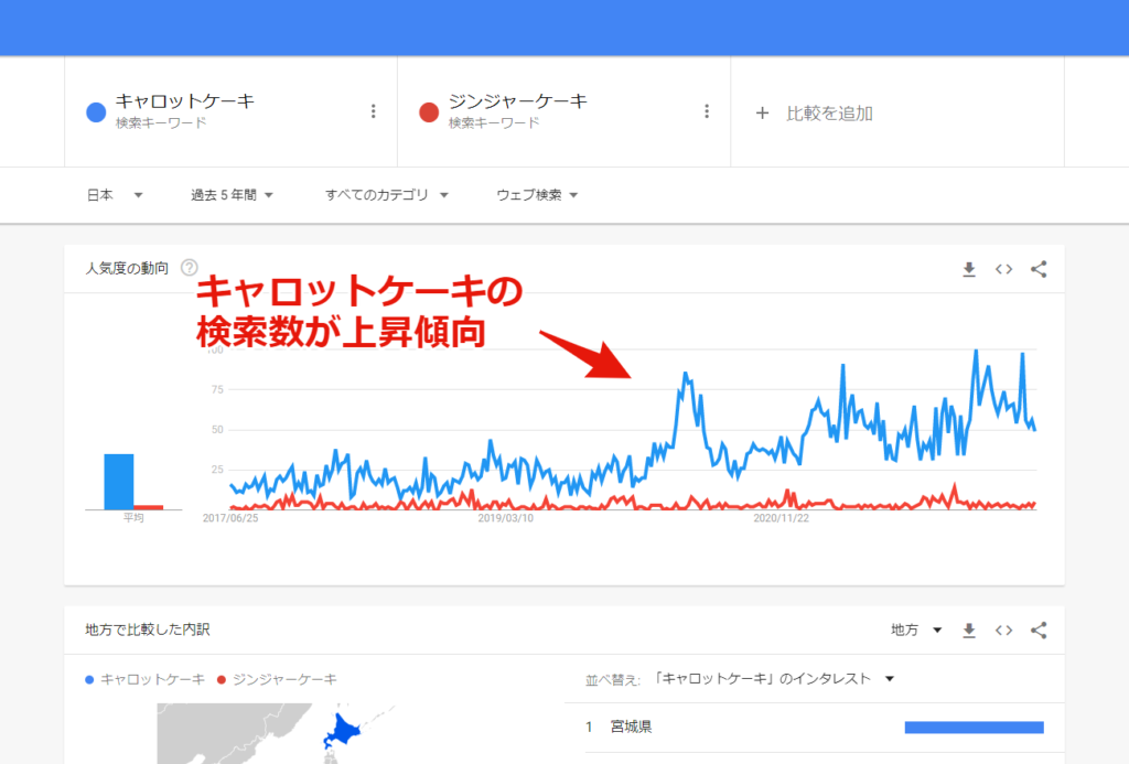 過去5年間の検索ニーズの推移を見ると、ジンジャーケーキの検索数は一定のボリュームで推移しているのに対し、キャロットケーキの検索数は年々増加していることがわかります。