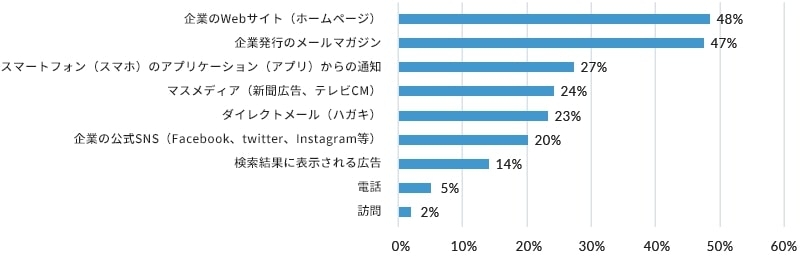 「企業の情報を得る最適な手段」として大きな割合を占めたのは「企業のウェブサイト」(48%)。ほぼ同率で、「メールマガジン」(47%)となっています。