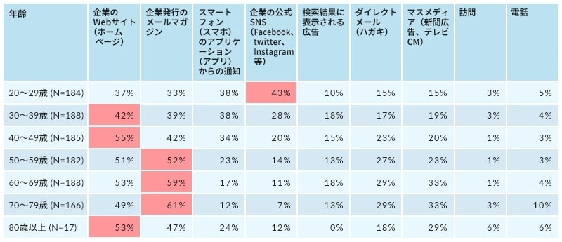 20代~30代では「企業の公式SNS」が一番割合が高く、40代~80代では「企業のWebサイト」「メールマガジン」の割合が大きいということがわかります。