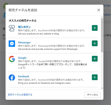 まずはカートボタンのコードを生成するために、販売チャネルを追加する必要があります。