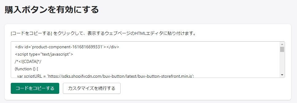 そのチャネルから生成したコードを、フリーページなどに張り付けることで、カートボタンを表示することができます。