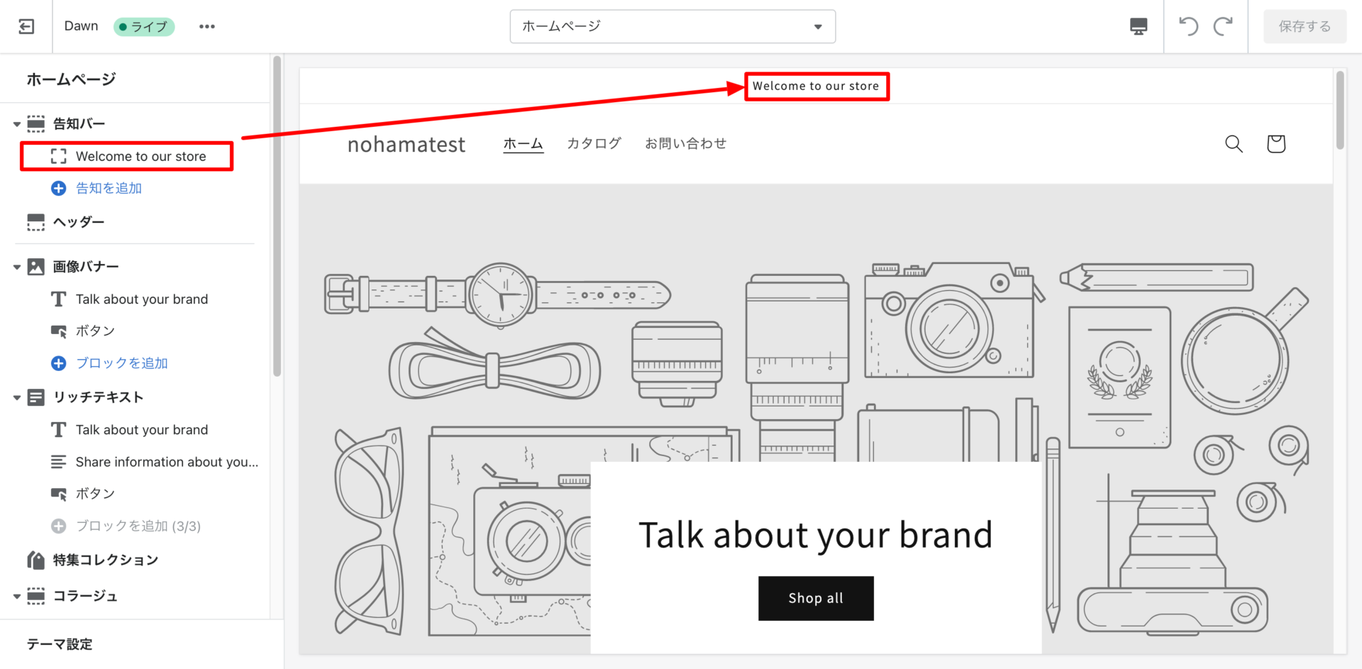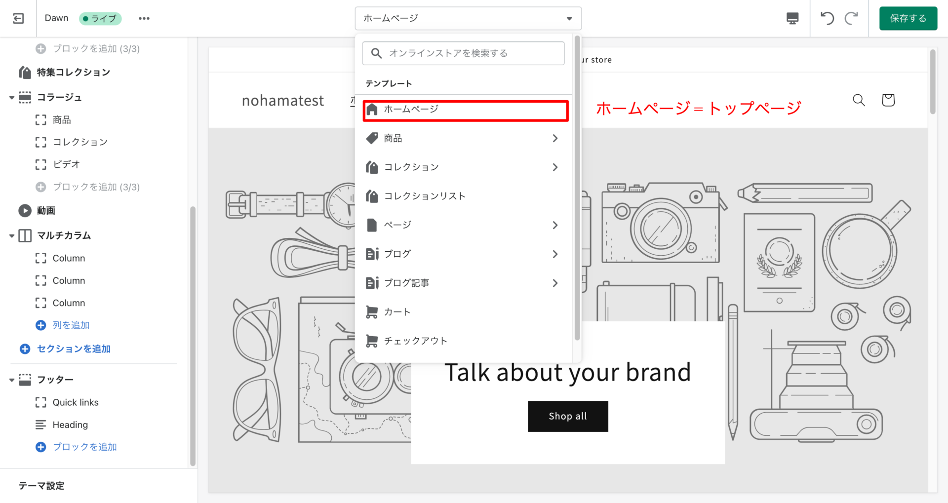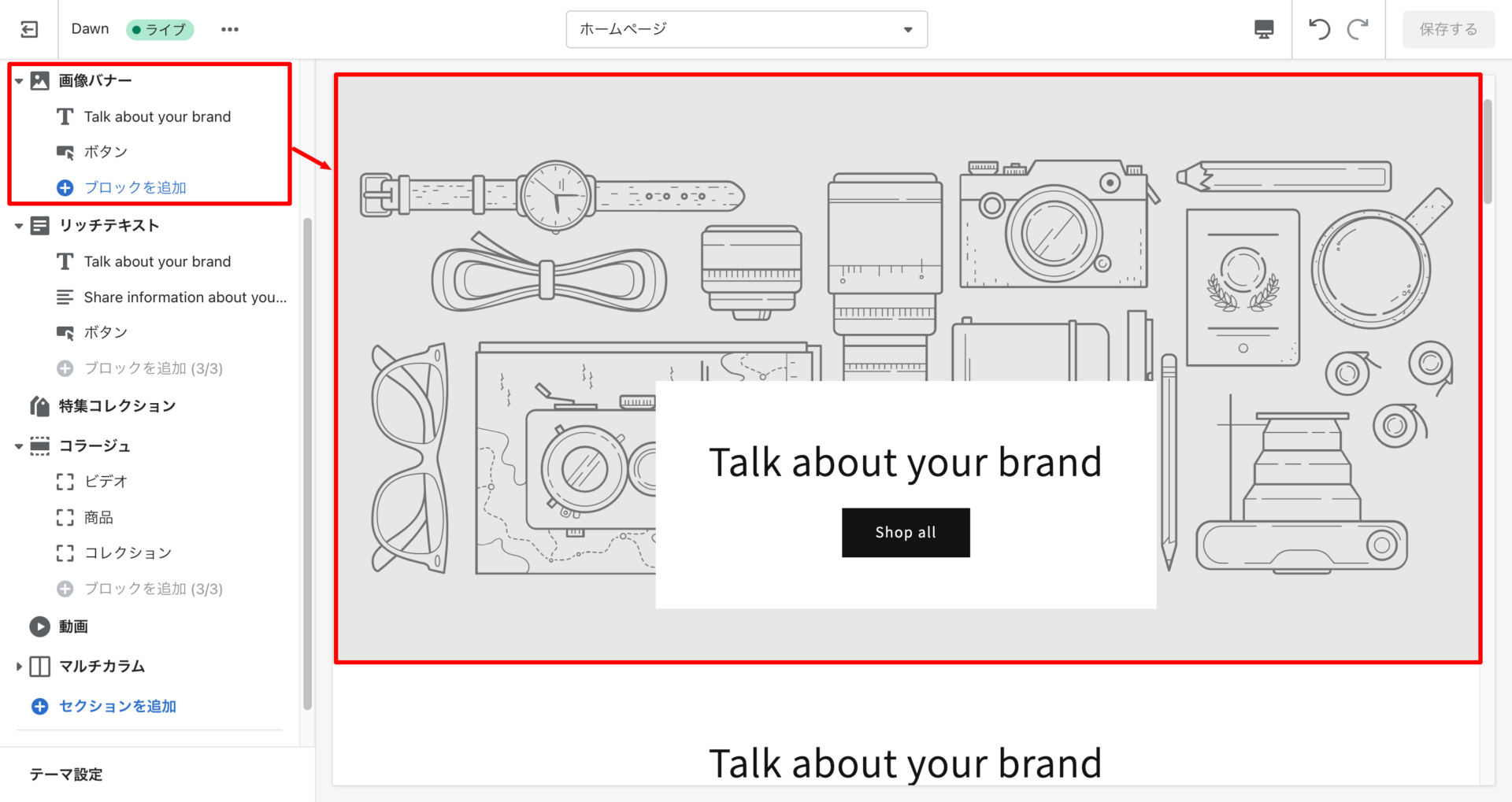 shopifyは基本、ページの中に各要素(セクション)を配置し、