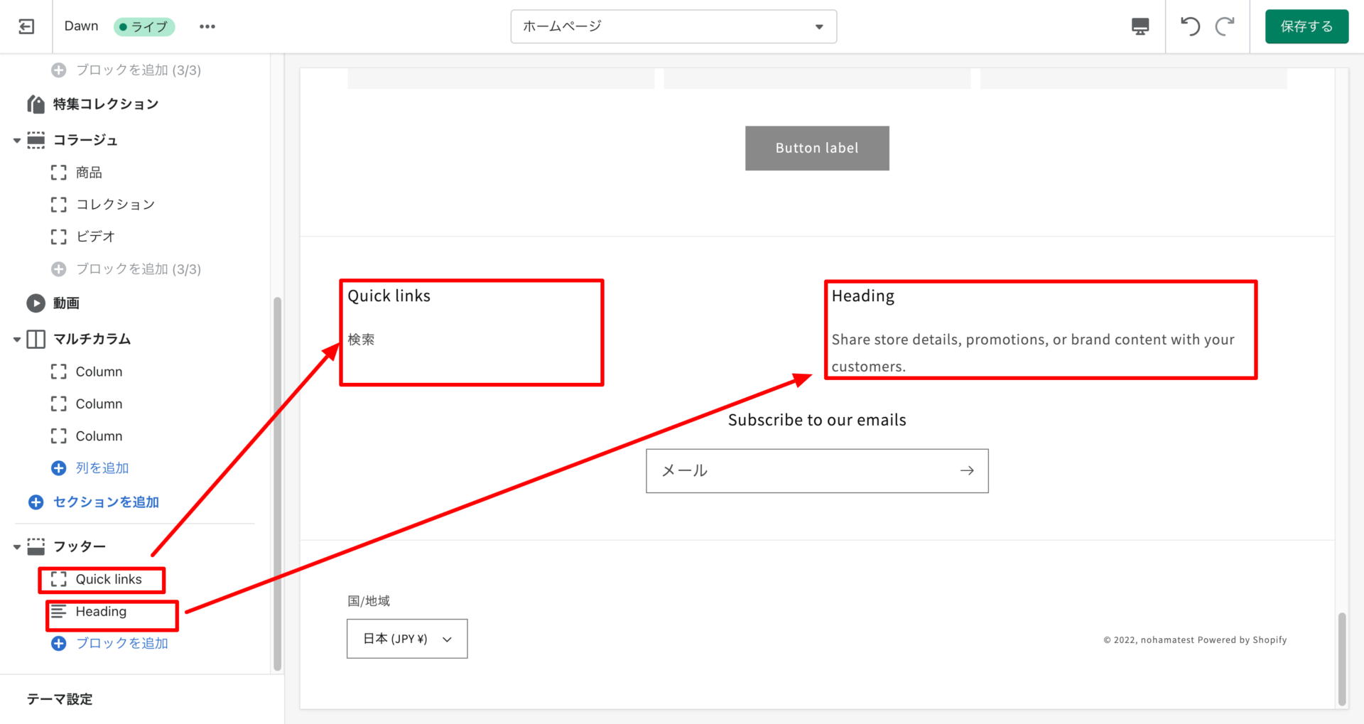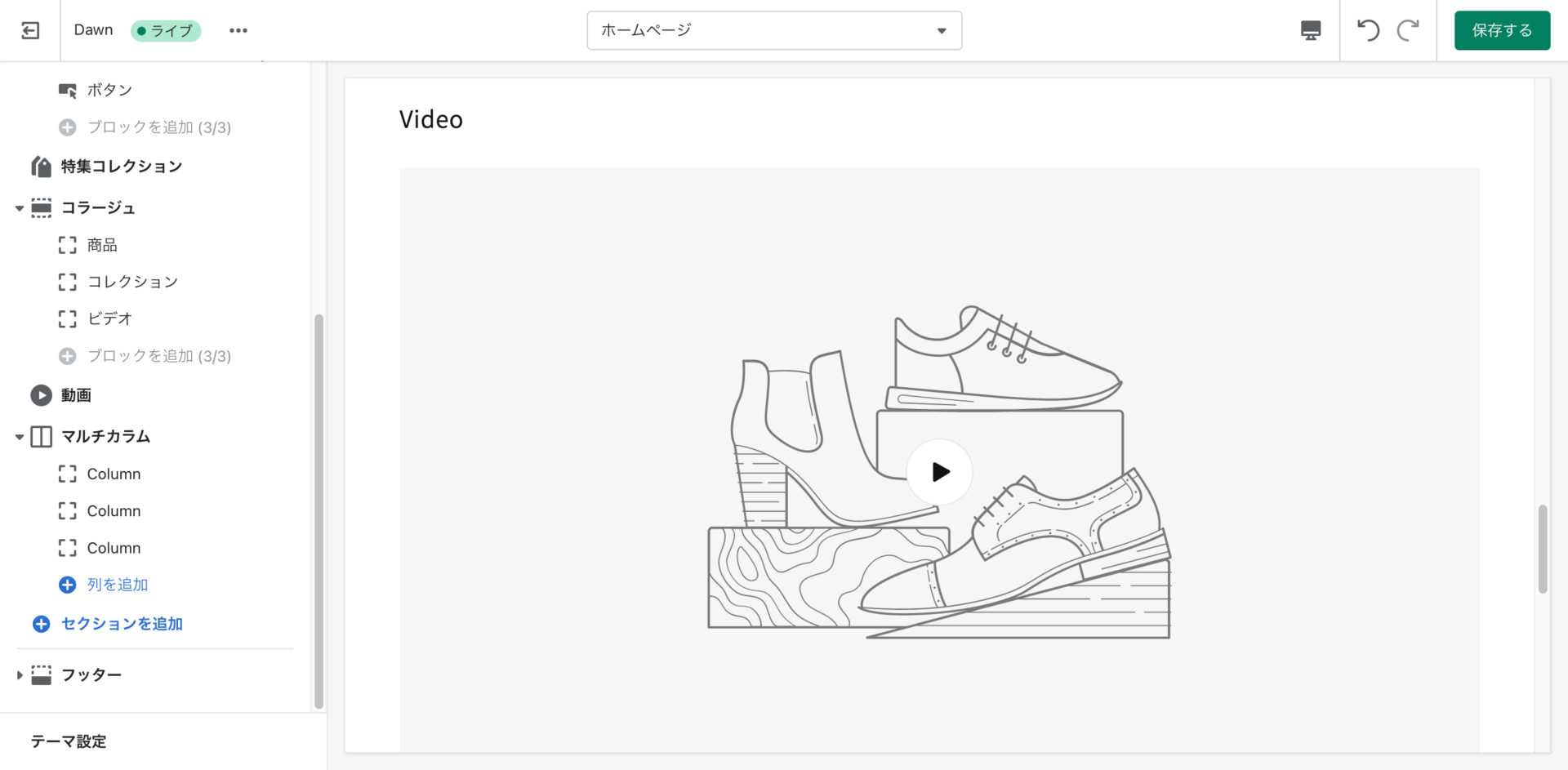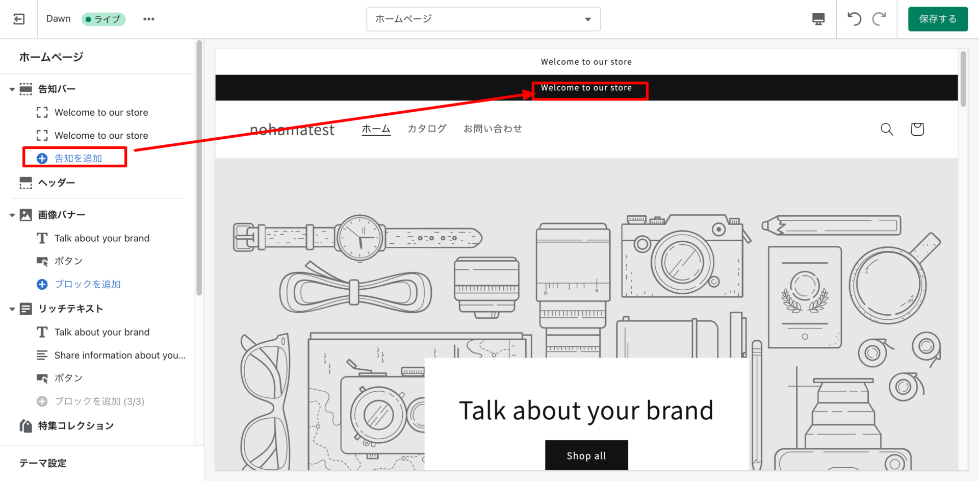 shopifyは基本、ページの中に各要素(セクション)を配置し、
