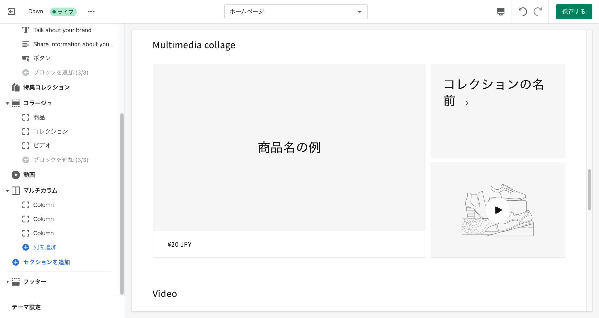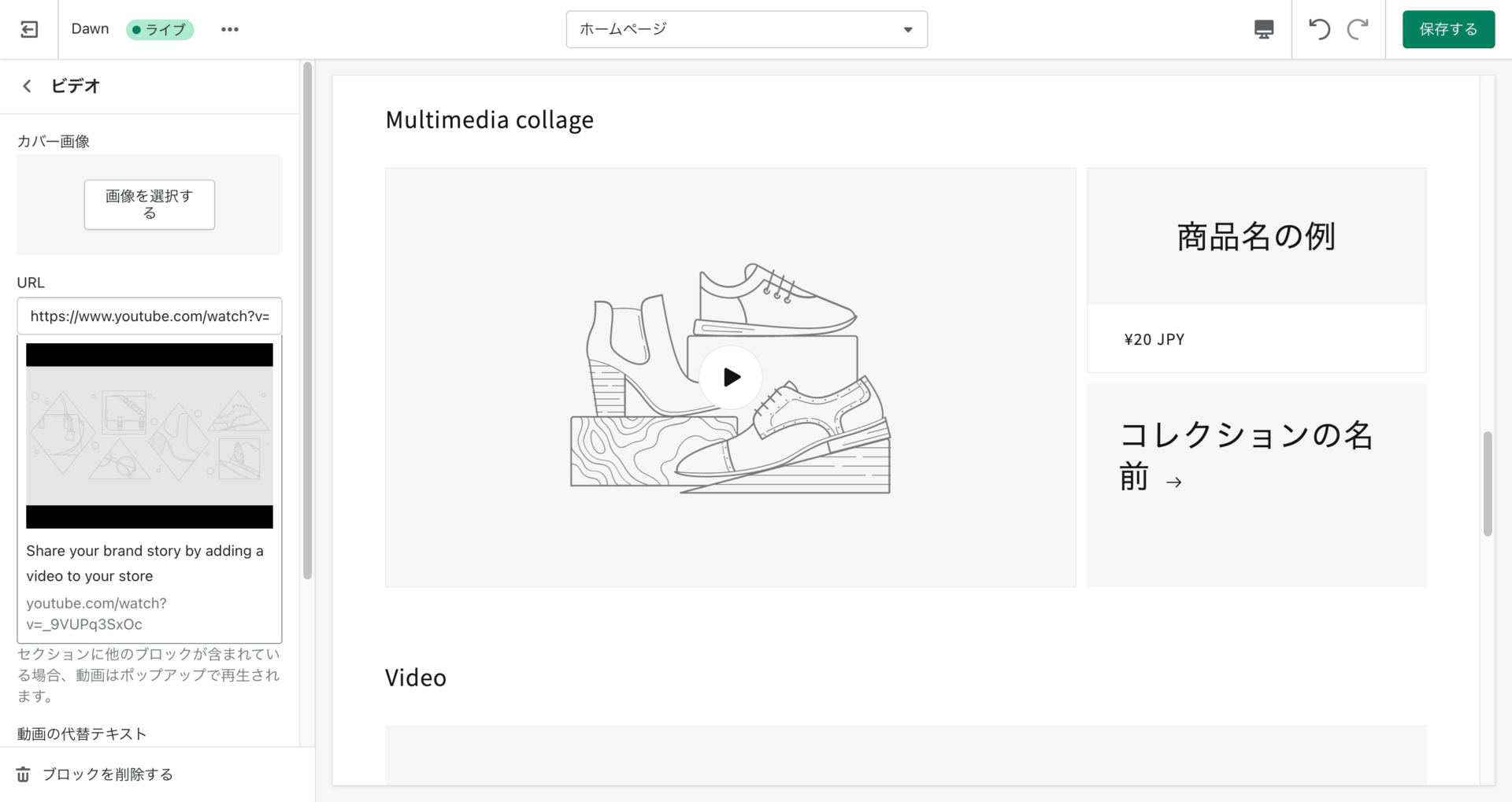 「ビデオ」「商品」「コレクション」を設定できます。