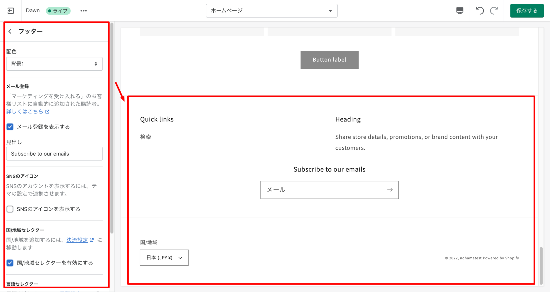 「配色」「メール登録」「SNSアイコン登録」「国/地域セレクター・言語セレクター・決済方法」を