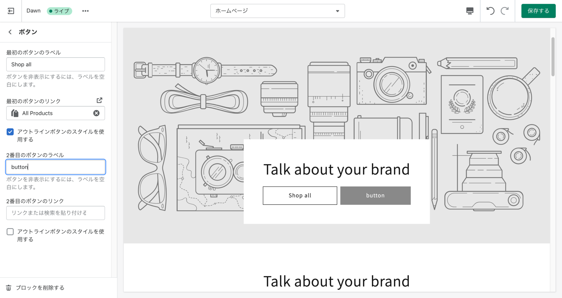 ボタンは下記画像のようにラベル、リンク、アウトライン化とボタンの追加が可能です。