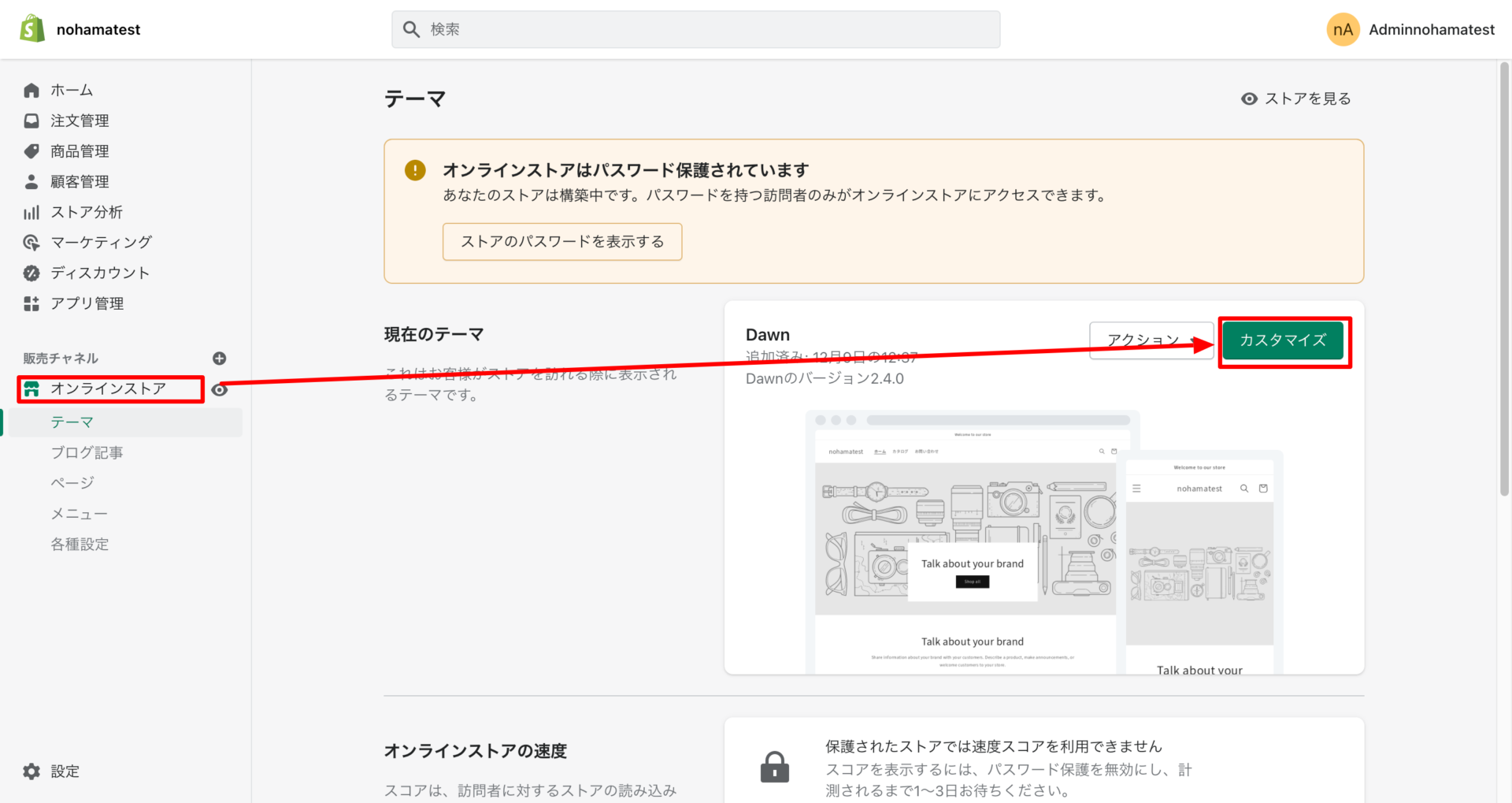 shopifyのカスタマイズは、下記画像の赤枠で記している所から行えます。