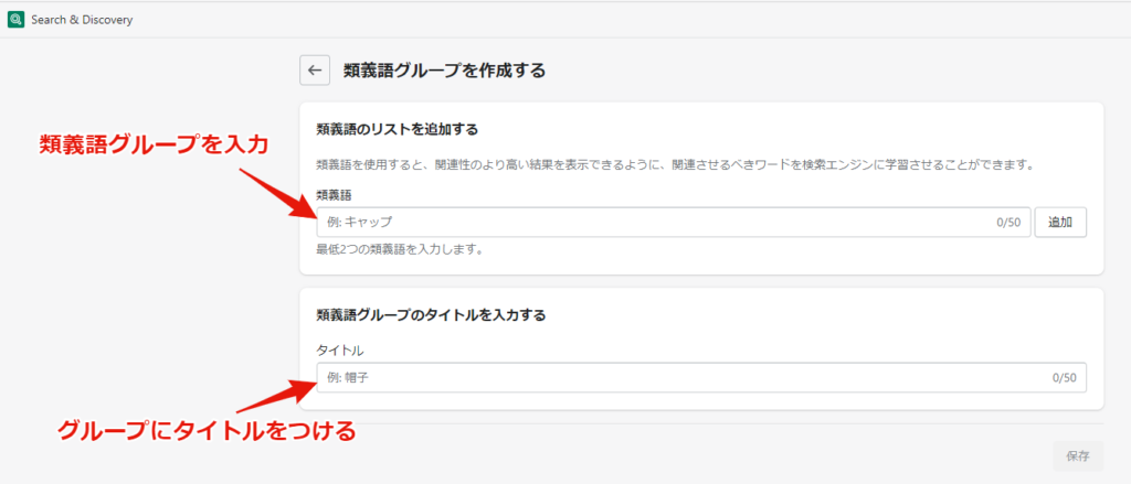 設定画面に入りましたら上段のエリアで、グループ化したい類義語を入力していきます。ここで登録したキーワードがグループとして見なされ、検索結果に反映されます。