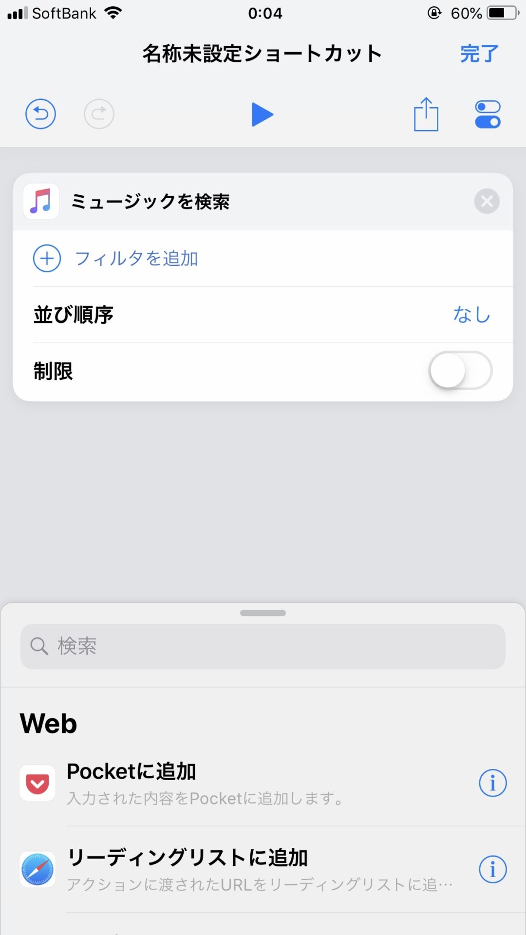 このままだと、ショートカット実行すると、この設定画面のままなので、再生後にミュージックアプリを起動するようにします。