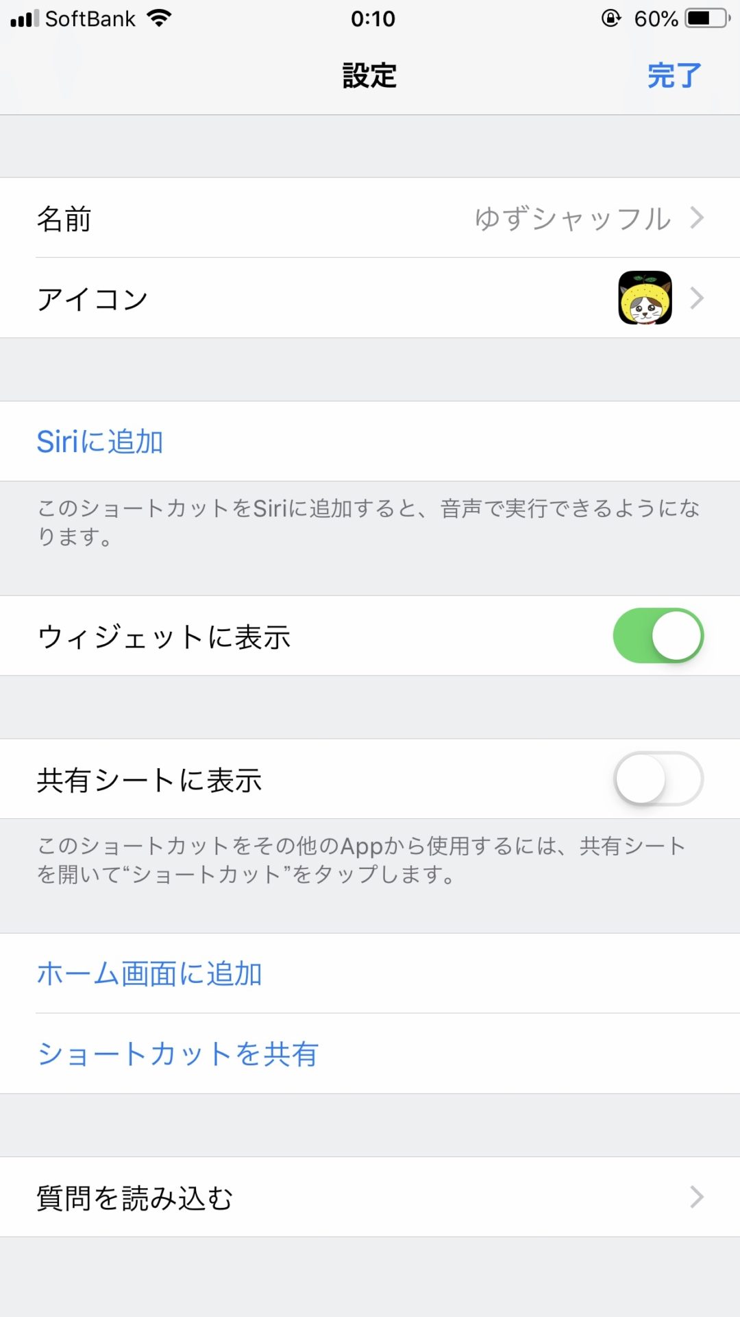 ここで作成したショートカットを、ホーム画面から実行できるようにします。