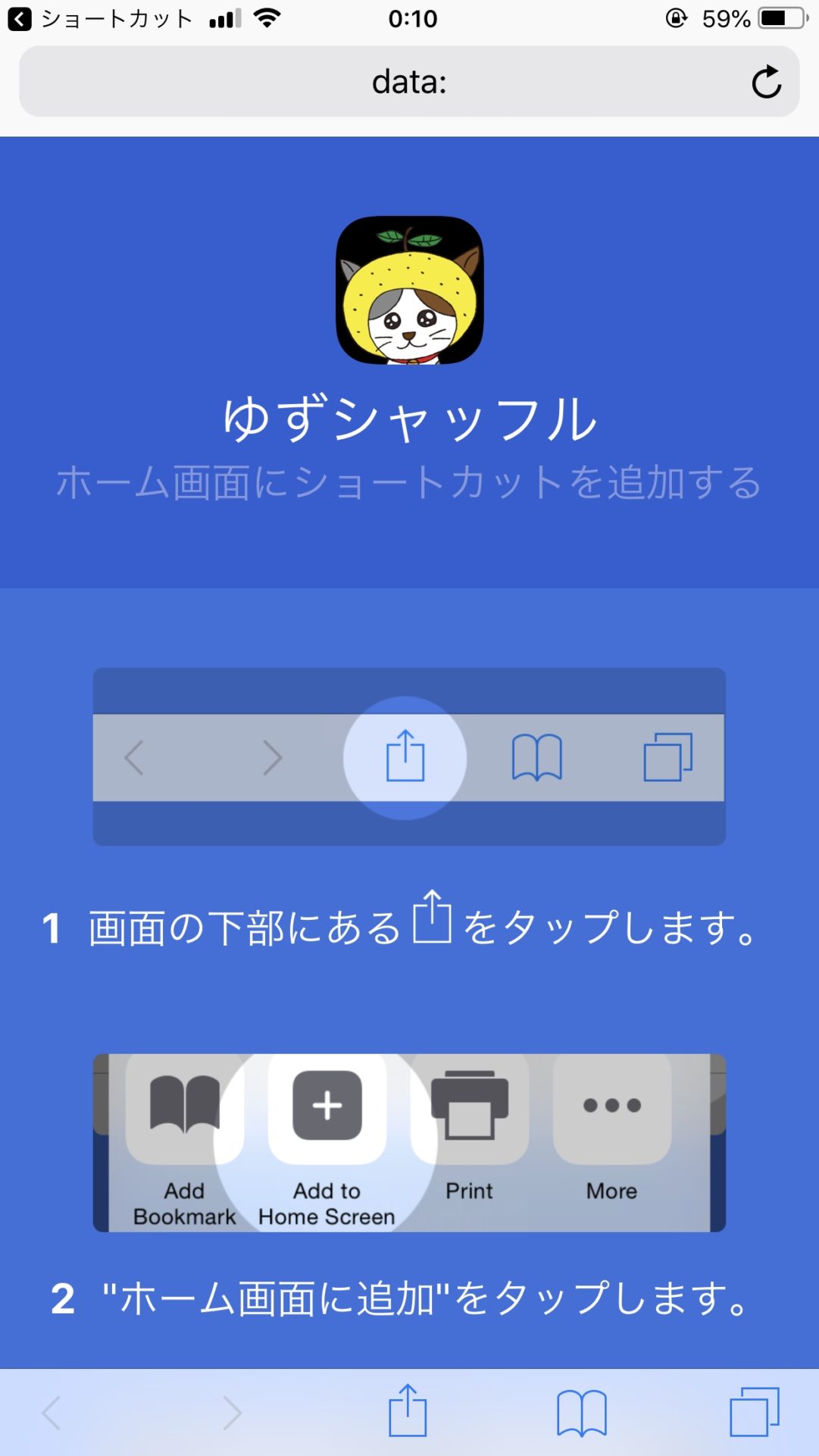Safariが起動するので、画面に出ている手順でホーム画面にショートカットを追加します。