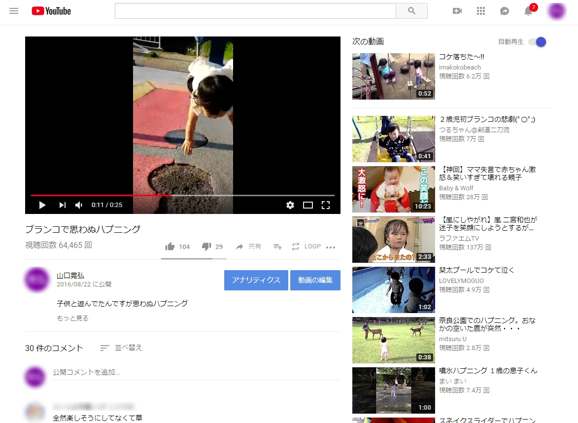 タグはグーグルとyoutubeに動画の内容を伝えるだけでなく他の動画のサイドバーで関連動画として表示もされるためしっかりと入れておきましょう。いかがでしたか?基本的なことなのですが、皆さん動画をアップすることに一生懸命になりすぎて基本的な設定ができていないなんてことがないように気をつけましょうね。ちなみに私は携帯をすぐに壊すので娘の成長を自分のyoutubeにアップしていっていたのですが、この記事を書く際に久々に自分の動画を見返したところ、ブランコで娘が落ちそうになった動画が検索結果にインデックスされたのか6万再生と30件のコメントが付いておりどうしようかと思っているところです。