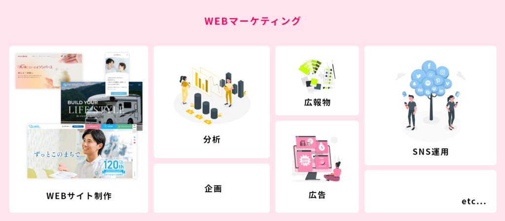 弊社はWEBサイトの制作やSNS・広告運用といったWEBマーケティングを通してクライアントの成長を支援しています。職種はデジタルですが、社員の教育や成長、お客様との繋がりや信頼関係といった、ある種アナログな部分を一番大事にしています。実際のお仕事の例をお見せしながら、具体的にどんなことをやっているのかご説明します。
